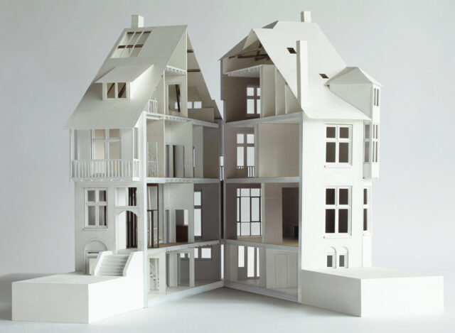 De authentieke details en ornamenten zijn abstract wit geschilderd. De nieuwe vloer in hal en woonkeuken is uitgevoerd in gepolijst wit marmer. De toegevoegde interieurelementen zijn daarentegen donker en ruw: vervaardigd uit gerookt eikenfineer brengen zij contrast, warmte en intimiteit.