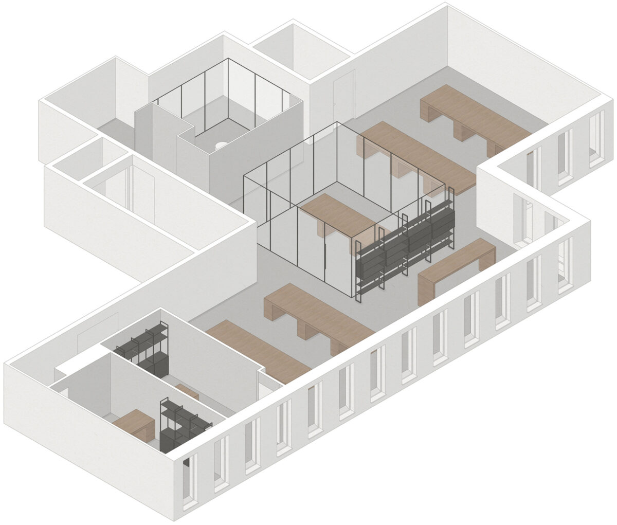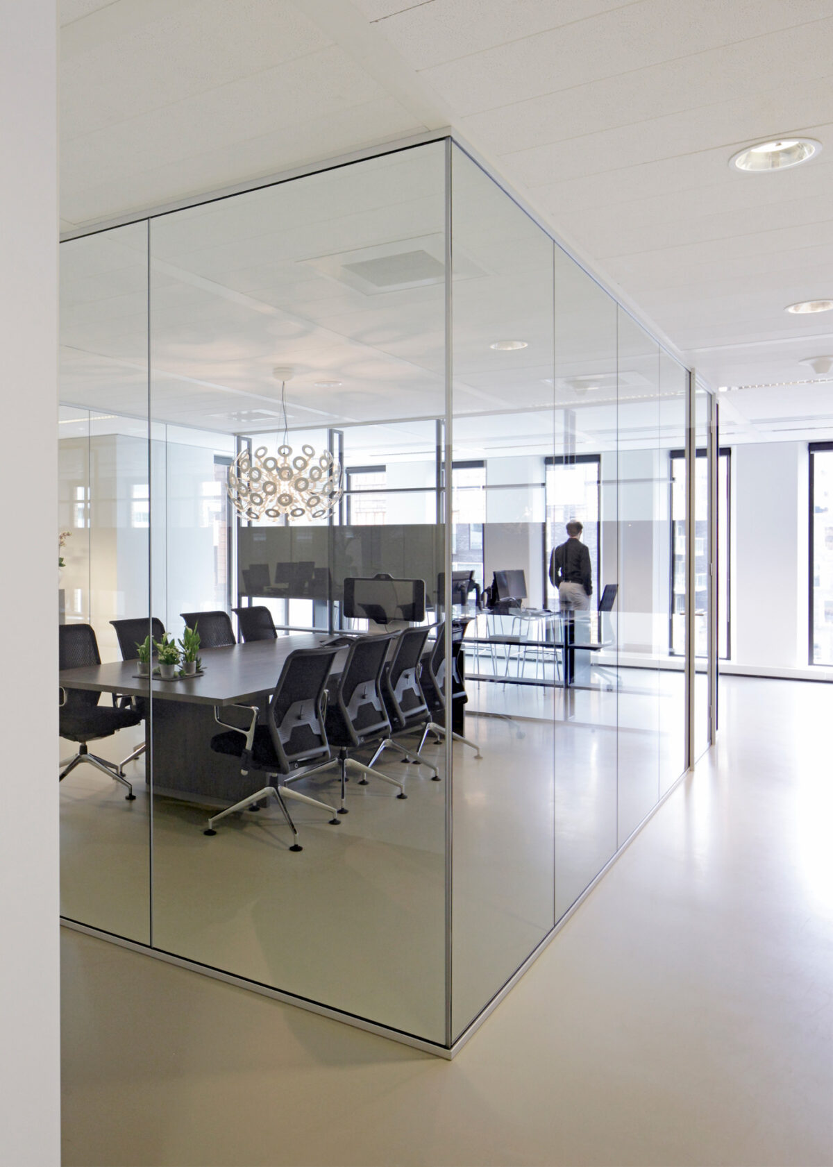 Thanks to the transparency of the central meeting room, the office retains a sense of openness and daylight can penetrate deep into the interior. The glass box divides the open workspace into three zones: a shared coffee and lunch area and two zones with flexible workstations.