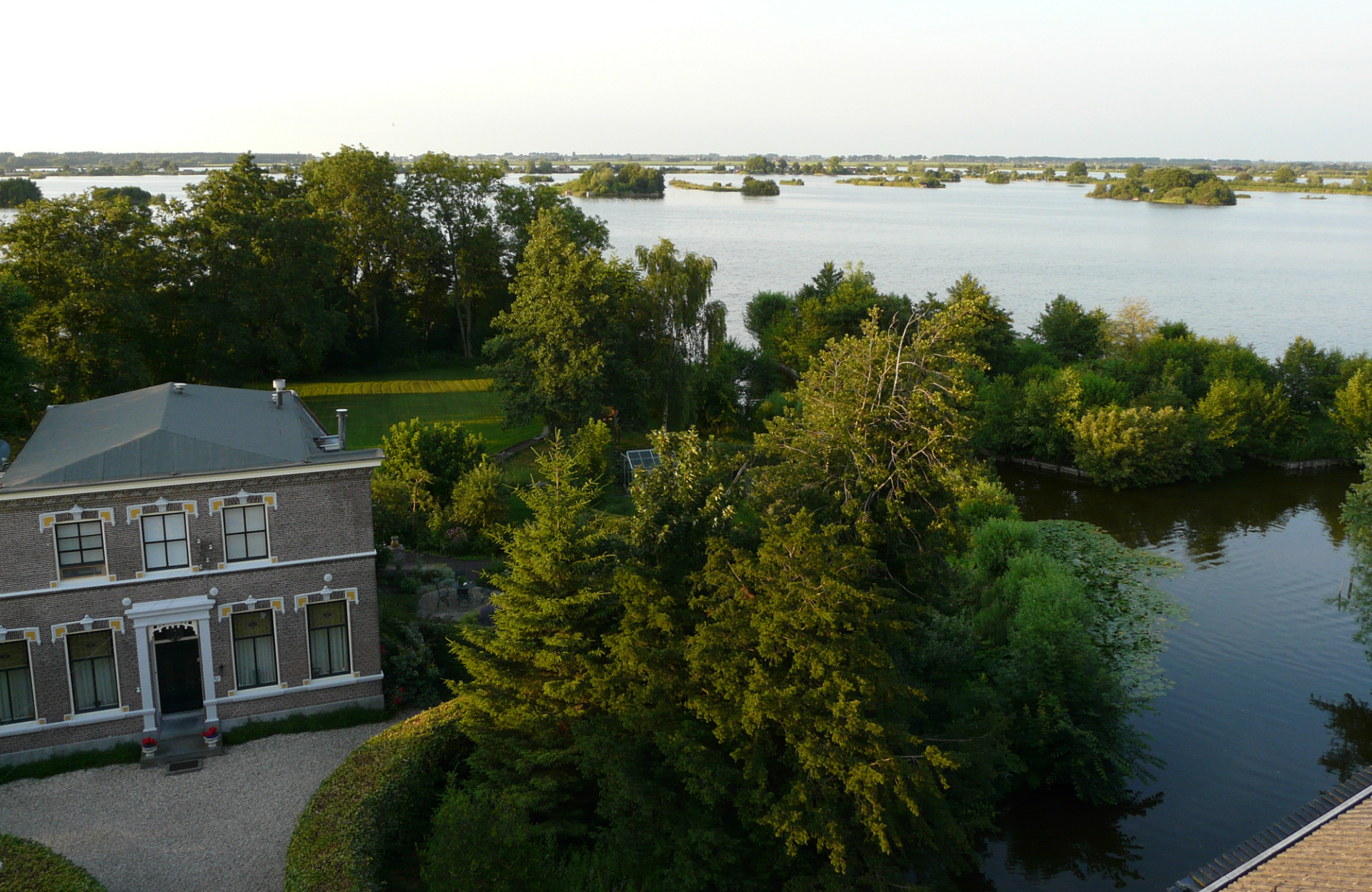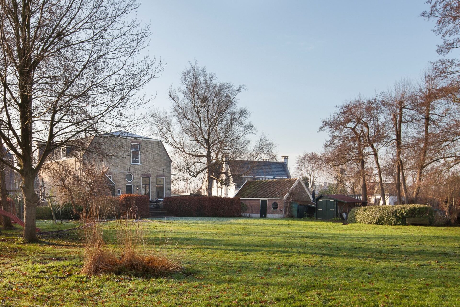 On the side facing the church, the two-storey building features an elegant and representative facade. The interior still contains many characteristic elements of a late nineteenth-century residence, including a marble entrance hall, living rooms with ensuite doors, fireplaces and reed ceilings. At the rear, the brick house is surrounded by a generous garden overlooking the surrounding waterscape.
