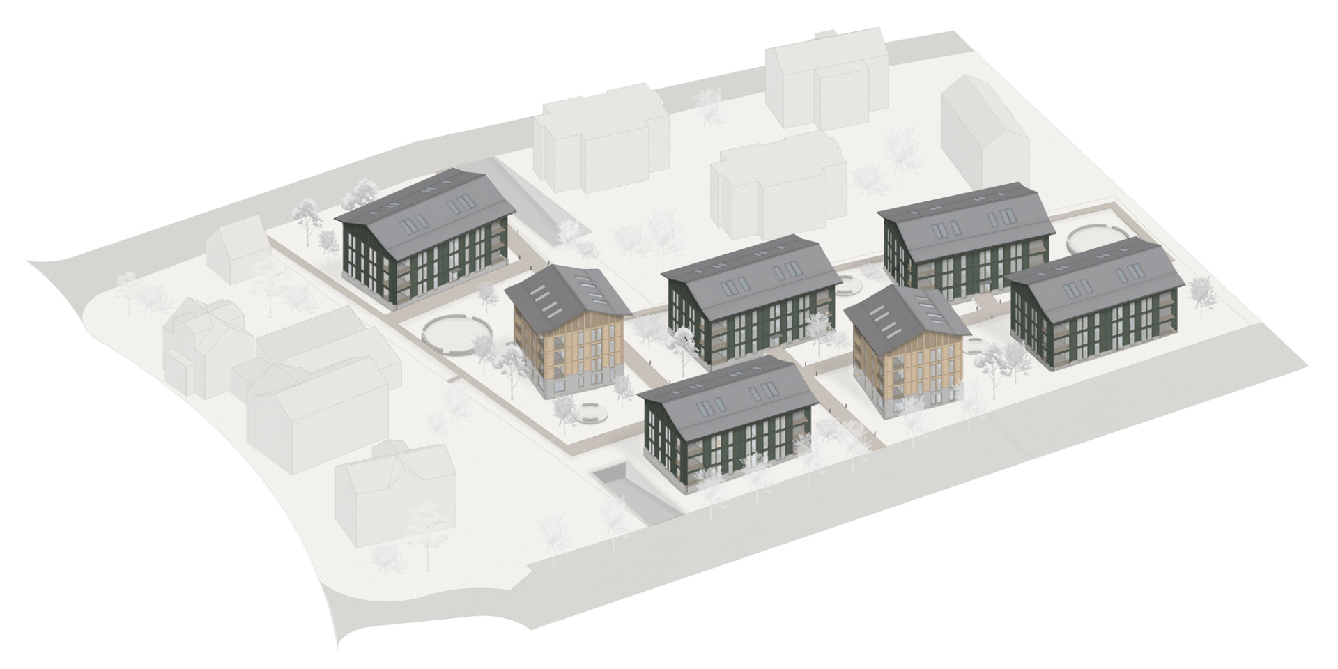 The buildings will be realized in a hybrid construction of wood and concrete, referencing the traditional timber-framed houses still found in the region. By employing wood for the main structural elements, the project not only ties into local building traditions but also strengthens them—creating opportunities for local employment, knowledge exchange, and training in timber construction.