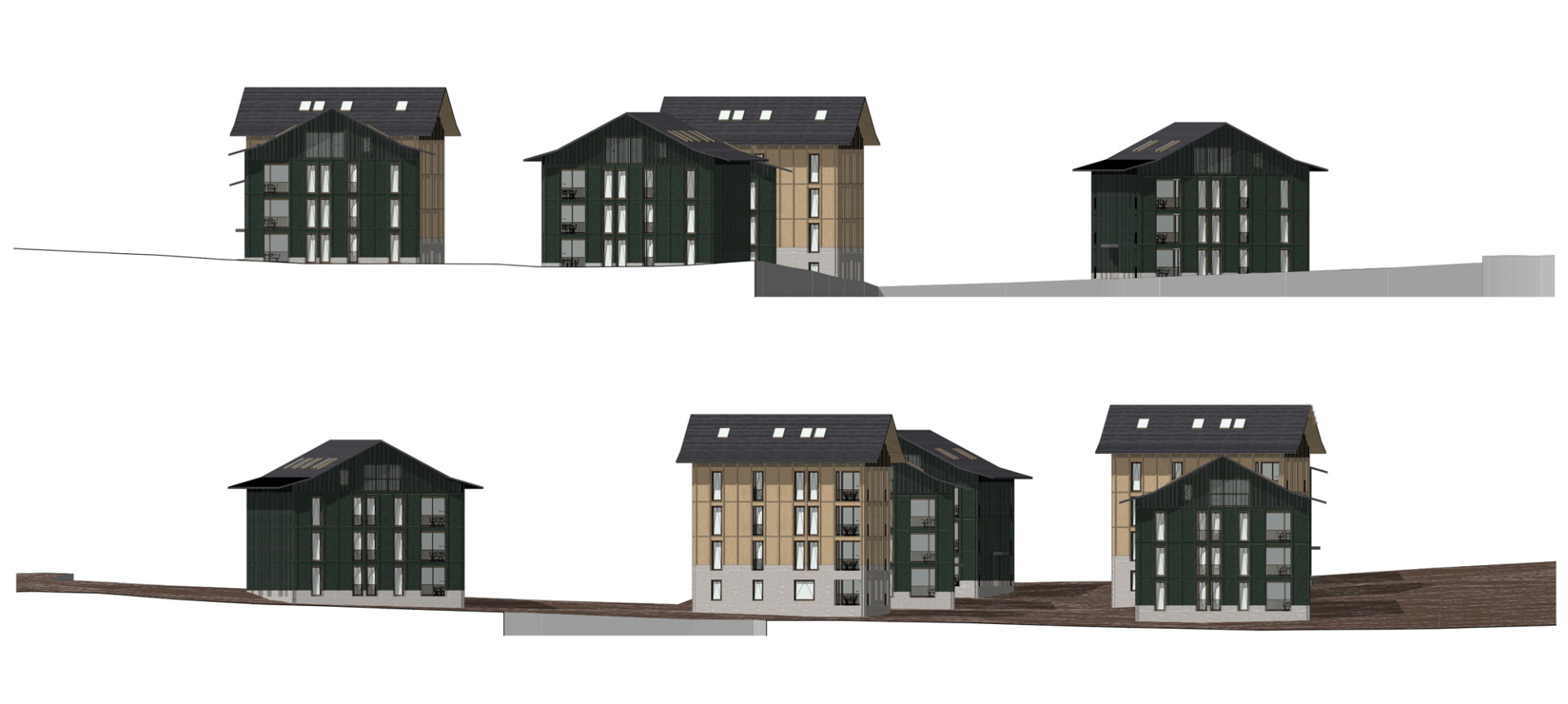 In the new plan, variations in orientation, size, and color create lively sightlines and perspectives. Cohesion across the ensemble is ensured through consistent materials and detailing. The facades highlight craftsmanship and traditional simplicity: wooden structures, elegantly shaped gutters, and exposed downpipes recall details of the historic village architecture.